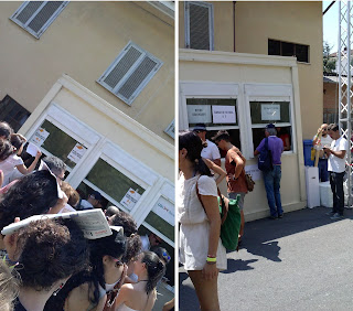 Il biglietto quest'anno costa 5 euro in più rispetto al 2014. Ovvero: 13,05 + 1.95 di prevendita. Il nostro ne ha acquistati 4 e deciso di comprarli su ticketone. 4x15= 60 euro. Più 6 euro per le spese di servizio. Totale, 66 euro. Il vantaggio di acquistare on line è quello ovviamente di accaparrarsi i biglietti prima degli altri e non rischiare sold out. E poi di evitare le code. A sorpresa, i due sportelli ticketone sono assediati, mentre la biglietteria "normale" è deserta. Chi arriva sprovvisto del biglietto paga ed entra, in 5 minuti al massimo. Senza inutili attese. Stesso discorso per chi avuto il clamoroso culo di acquistare su ciaoticket. E c'è anche uno sportello riservato ai clienti UbiBanca. In ogni caso, il sole scotta e la temperatura sale, in tutti i sensi. Il nostro ha preso i biglietti anche per i propri genitori i quali, però, per via del gran caldo, hanno deciso di rimanere a casa. Chiede perciò se sia possibile fare una sorta di cambio, magari acquistandone due per il giorno dopo. Non si può, se ne fa subito una ragione.