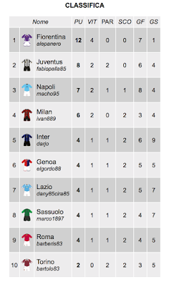 Allora, piccolo approfondimento sui match clou scelti dalla redazione. Impossibile non parlare del big match tra Napoli e F.. Vincono per mezzo punto i viola, sulle ali dell'entusiasmo e di Gastone Paperone. Questo il commento (audio) di A.P., uno dei due manager:
