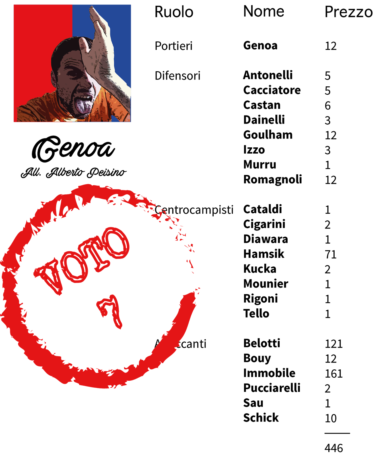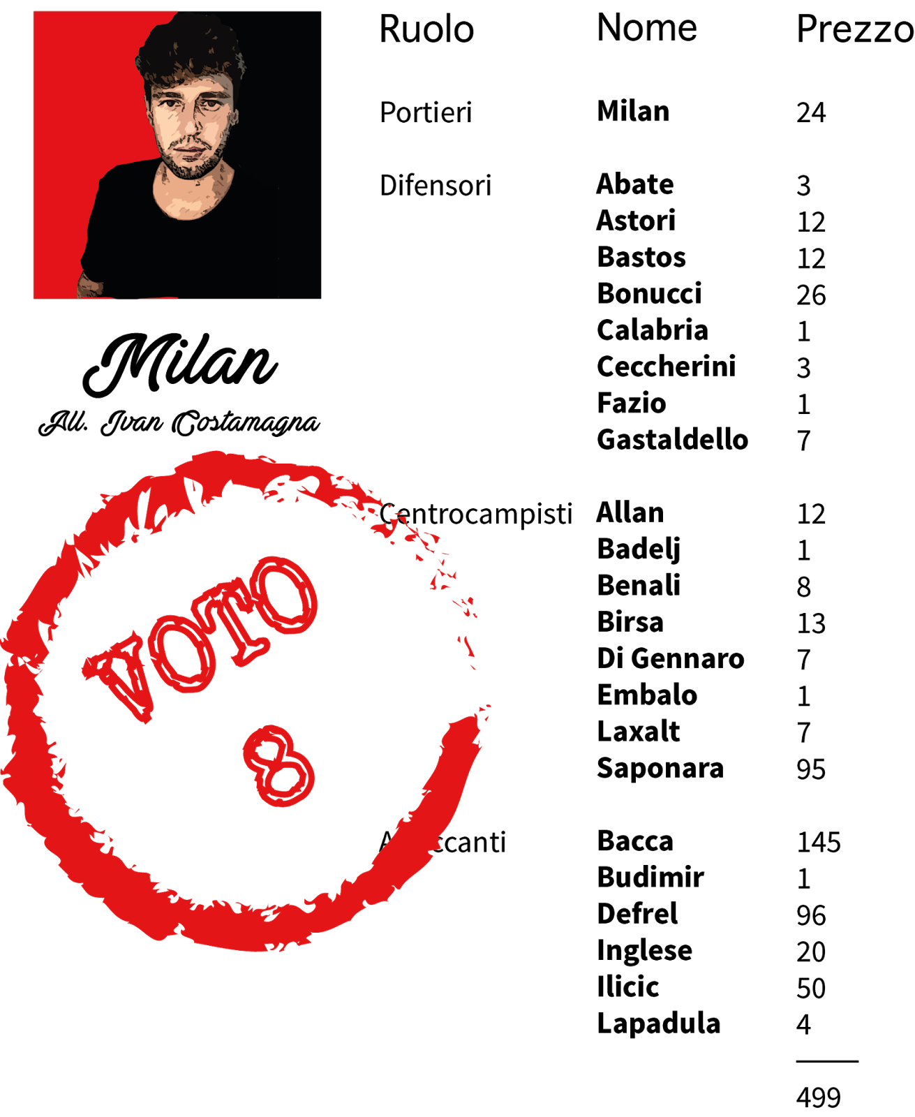 Voto alto per Ivan che ha allestito una rosa equilibrata. Il centrocampo è più che altro di sostanza, con un Saponara in più (sempre che ritorni ai fasti di due stagioni fa) e la supposta continuità in zona gol di Birsa. Senza contare il colpo Bonucci in difesa, soprattutto in ottica assist. Non male l'attacco: occhio alla scommessa Lapadula, strappato a soli 4 crediti.