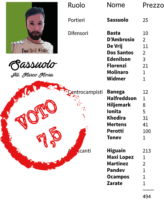 Non più di un 7,5 per Lorenzo (e sono stato larghetto). E spiego il perché: ci sono alcuni buoni colpi (Florenzi, Khedira e Martens su tutti) ma 100 per Perotti e tutto l'attacco sulla gobba dell'appesantito Higuain potrebbero davvero far naufragare il Sassuolo di Morra. Certo, se poi il Pipita fa i gol dello scorso anno, allora non stiamo neanche qui a parlarne. Ma coi se e coi ma non si vincono leghe tanto equilibrate. E poi Molinaro, ma mi faccia il piacere!