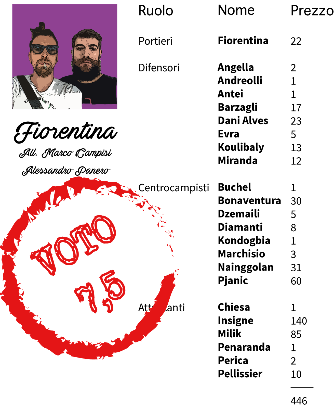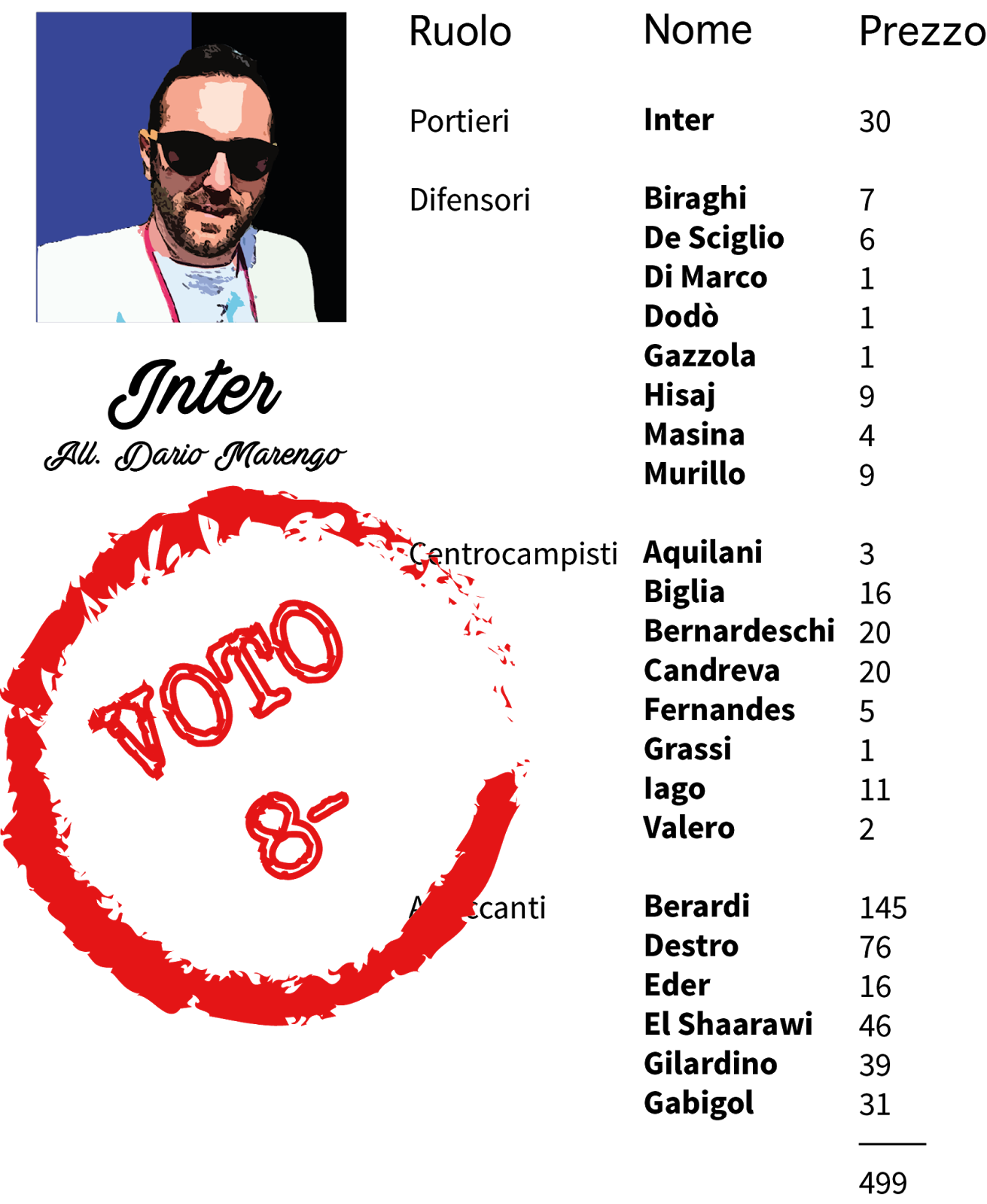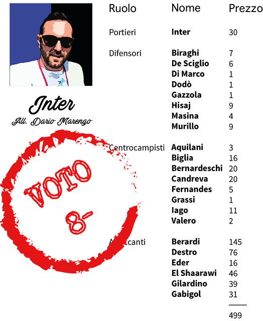 Partiamo da un presupposto: se avessi partecipato, avrei fatto una squadra molto simile. Il centrocampo è principesco, se vincono la scommessa Kondogbia si candidano seriamente per la vittoria finale, e anche Buchel a 1 è tutt'altro che male. Dietro 3 grandi certezze (Dani, Koulibaly e Barzagli), davanti dipendono un po' troppo dalla vena del Napoli. Penaranda è giù culto. Ah, non è un 8 perché sono troppo di parte.