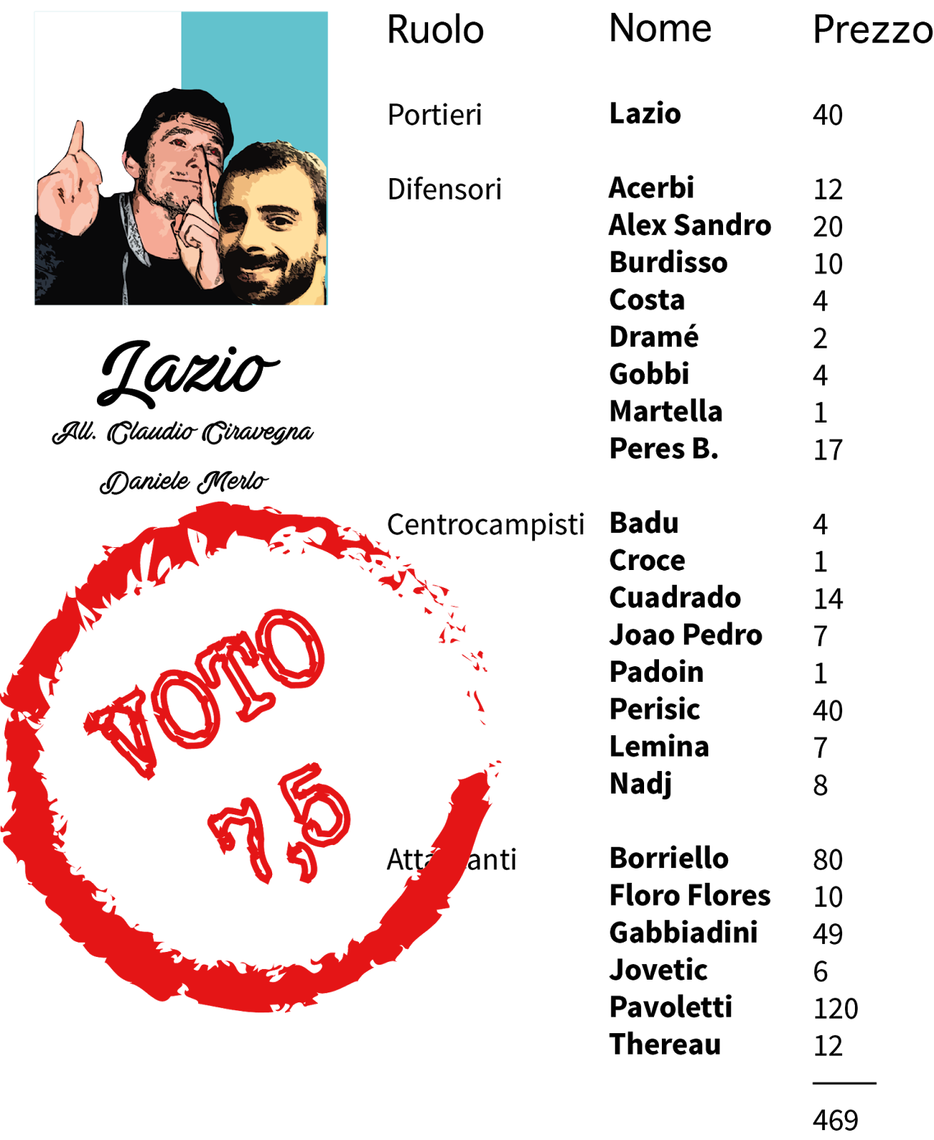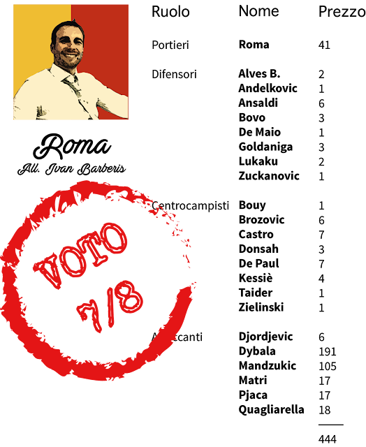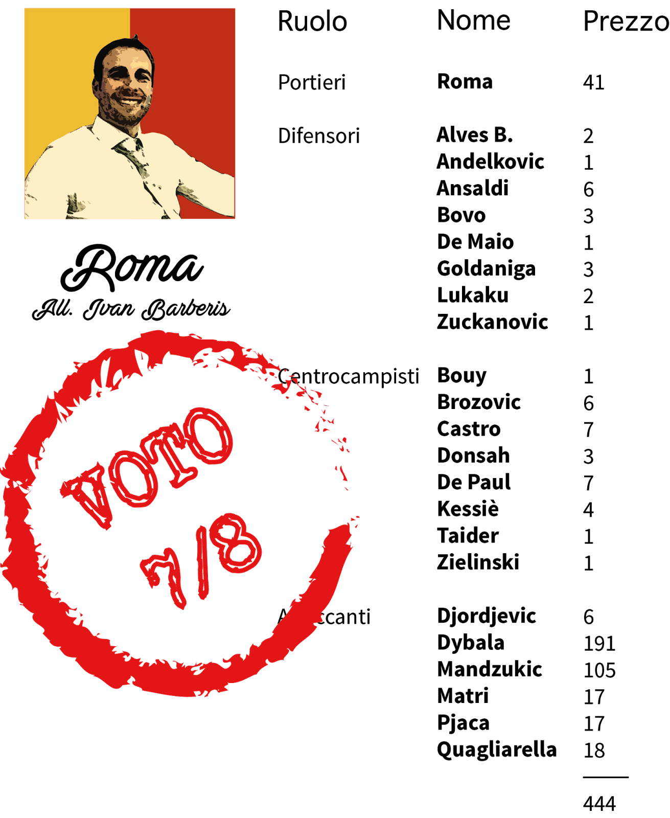 Eccolo qua, il più "taccagno". Ivan, come la formica, mette da parte un bel gruzzoletto per l'asta di riparazione e intanto si assicura la coppia Dybala-Mandzukic (oltre a Matri e Quagliarella) e Kessie, la vera rivelazione delle prime due giornate di campionato, acquistato per una cifra monstre al contrario di 4 crediti. La porta è romana, la difesa ancora ancora, il centrocampo rischia di rimanere spesso sguarnito. Il voto forse è un po' alto, ma con un po' di fortuna la Roma può tenere botta nel girone d'andata per tentare l'assalto dopo l'asta invernale, nella seconda parte di stagione. Il motto è: se po fà.