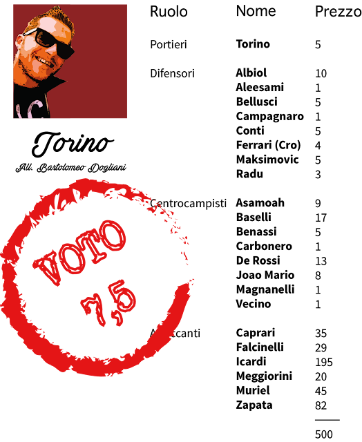 Bart, cuore bianconero, sceglie di puntare sul Toro. Clamoroso a Cherasco. Ecco perciò tutto il pacchetto di portieri, alcuni giovani interessanti come Baselli e Benassi e l'ex Maksimovic. Non è una brutta squadra, ma manca qualcosa lì in mezzo, col sopravvalutato per eccellenza che puntualmente genererà malus per la Dogliani band. Io credo in Falcinelli e pure in Zapata, se Icardi fa il proprio dovere Bart può essere la sorpresa del FantaCherasco.